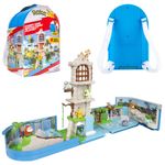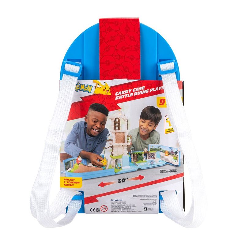 O Playset de Batalha Portátil transforma uma mochila compacta em um cenário de aventura repleto de emoção, com quatro zonas interativas. Acompanha uma figura de Pikachu de 2 polegadas, que pode atravessar desafios como um desfiladeiro rochoso, uma ponte suspensa, uma cachoeira e um templo misterioso com elevador escondido e várias plataformas. No topo, uma chama precisa ser acesa, e a batalha continua nas marés com dois lançadores de batalha. Quando a diversão chega ao fim, o playset se dobra novamente como uma mochila, pronto para ser levado para a próxima jornada. Compatível com figuras de batalha Pokémon de 2 polegadas (vendidas separadamente).