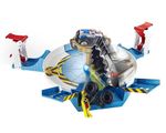 Este conjunto e uma batalha arriscada de Monster Trucks, onde os vencedores ganham o trofeu e todos podem ser devorados pelo tubarao! Os Monster Trucks em escala 1:64 da Hot Wheels com suas rodas gigantes competirao com um tubarao assustador. Um veiculo e um Racing Truck da Hot Wheels® feito em die-cast e o outro e o carro de testes desmontavel “Crash Recruit”, exclusivo deste conjunto. As criancas tentarao correr contra o tempo em uma arena circular com um enorme trofeu no centro. Coloque os Veiculos nos lancadores opostos e jogue um contra o outro no modo de dois jogadores! Chegue ate o trofeu para vencer ou perca e vire comida de tubarao!