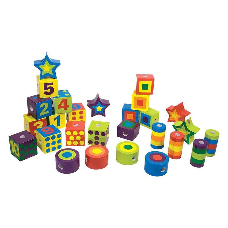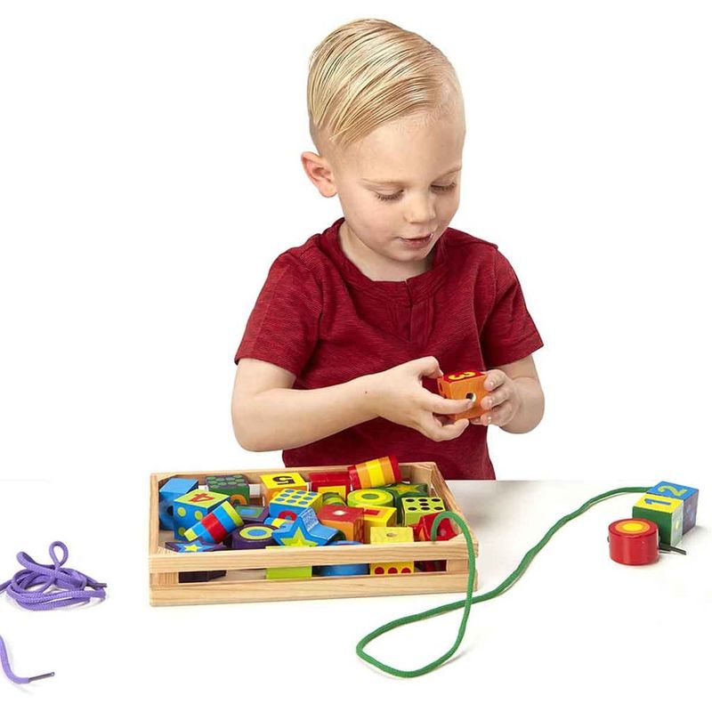 Contas de madeira em formatos familiares para atividades de amarração que desenvolvem habilidades. Inclui 27 contas e 2 laços em uma bandeja dividida de madeira resistente para fácil limpeza e armazenamento. As contas apresentam números de 1 a 10 como números e pontos. Promover contagem, reconhecimento de formas, olho-mão e criatividade. *É um ótimo presente para crianças em idade pré-escolar, de 3 a 6 anos, para atividades práticas, jogo sem tela.