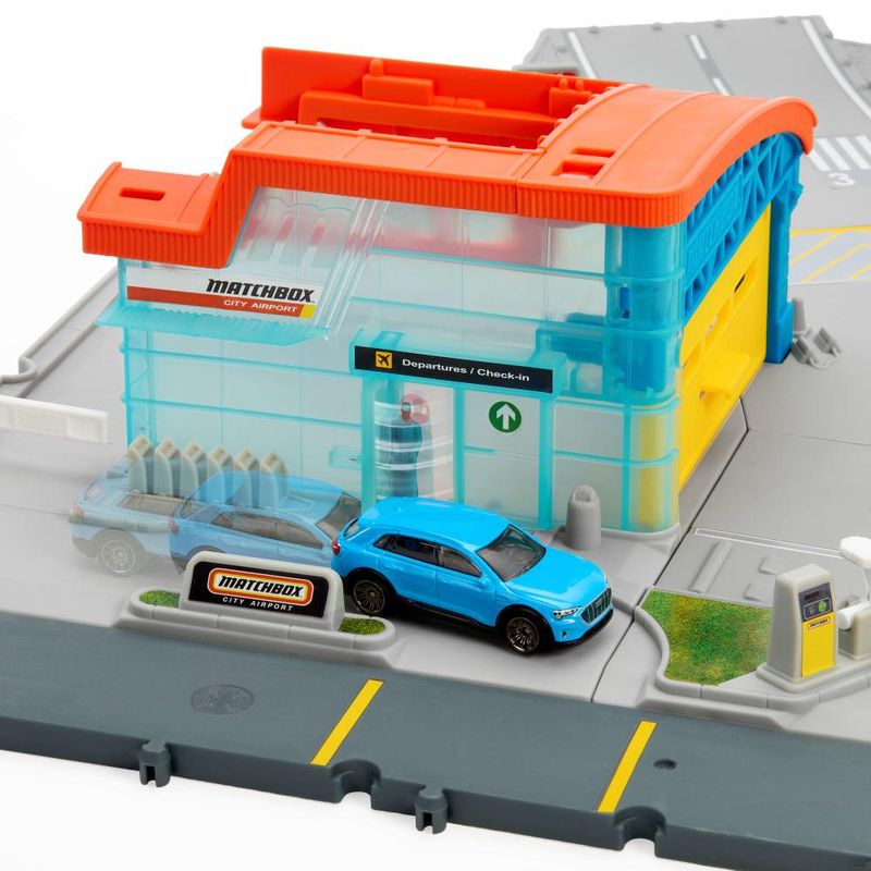 Inclui 1 Conjunto Matchbox Aeroporto, com carro de brinquedo Audi e-tron, fundido em metal em escala 1:64, e 1 avião de plástico.