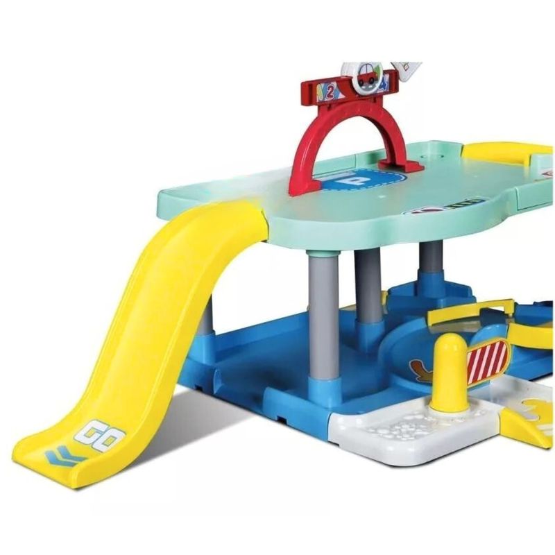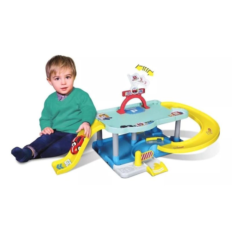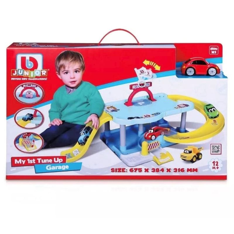 Traga o seu veículo BB Junior para um ajuste! Esta garagem possui 2 níveis e oferece estacionamento, rampas e portões para muita diversão com o seu carro. Inclui 1 veículo de roda livre. Ideal para estimular a imaginação e as habilidades motoras do seu bebê.