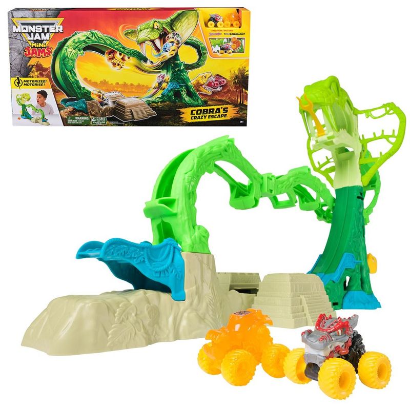 O Playset Fuga da Cobra leva a diversão para um novo nível com uma experiência emocionante na selva. Equipado com um sistema motorizado, ele permite que os mini trucks Mini Jams atravessem um percurso sinuoso e repleto de surpresas. O conjunto inclui dois veículos Mini Jams e um playset temático exclusivo, oferecendo horas de diversão. O Playset Fuga da Cobra também oferece espaço para mais veículos Mini Jams, aumentando ainda mais a ação e emoção. Perfeito para quem ama aventuras rápidas e intensas, este playset motorizado traz desafios empolgantes para os fãs de Monster Jam.