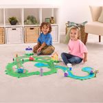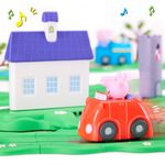 Escola e base, casa com extensão e base, carrinho vermelho, trem azul da Rebecca, barco do Vovô, 10 trilhos de estrada, 2 trilhos de ponte, 4 trilhos de ferro, 2 trilhos de curva de ferro, 5 trilhos de rio, 2 trilhos de curva de rio, 2 árvores padrão, semáforo de trem, semáforo de estrada, loja de sorvete, cafeteria, galinheiro e castelo.