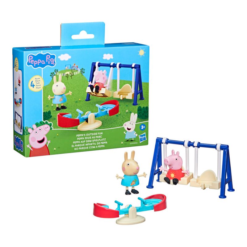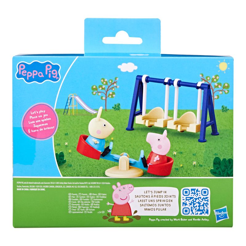 O brinquedo No Parque com a Peppa inclui figuras da Peppa Pig e sua amiga Rebecca Coelho, além de acessórios de balanço e gangorra