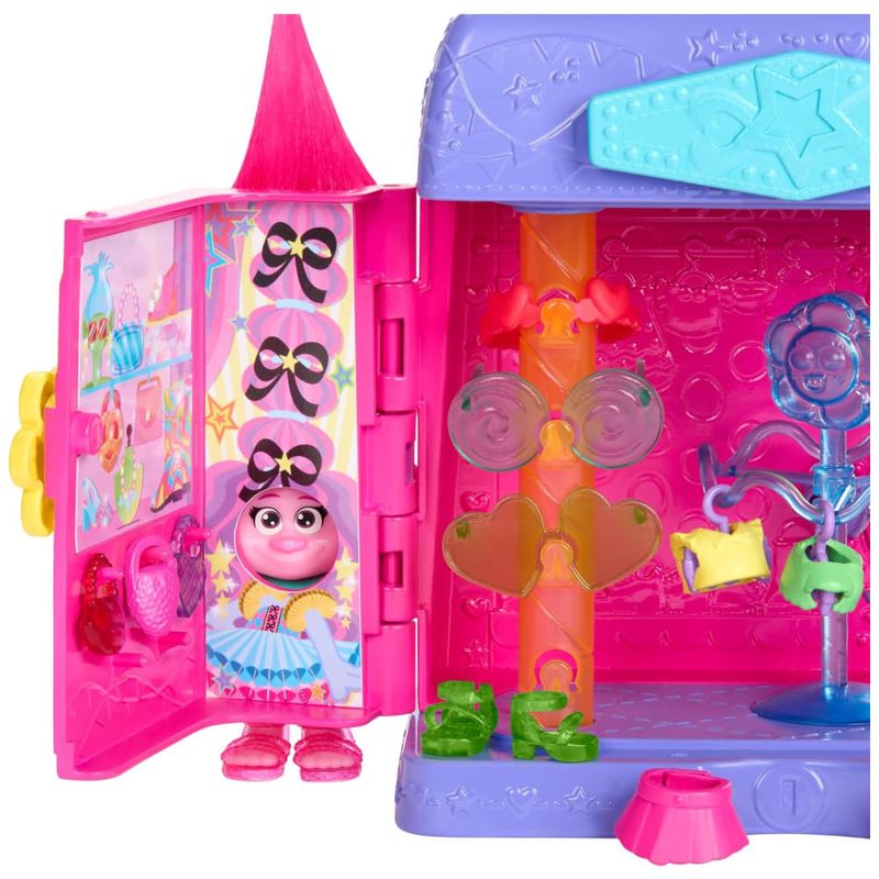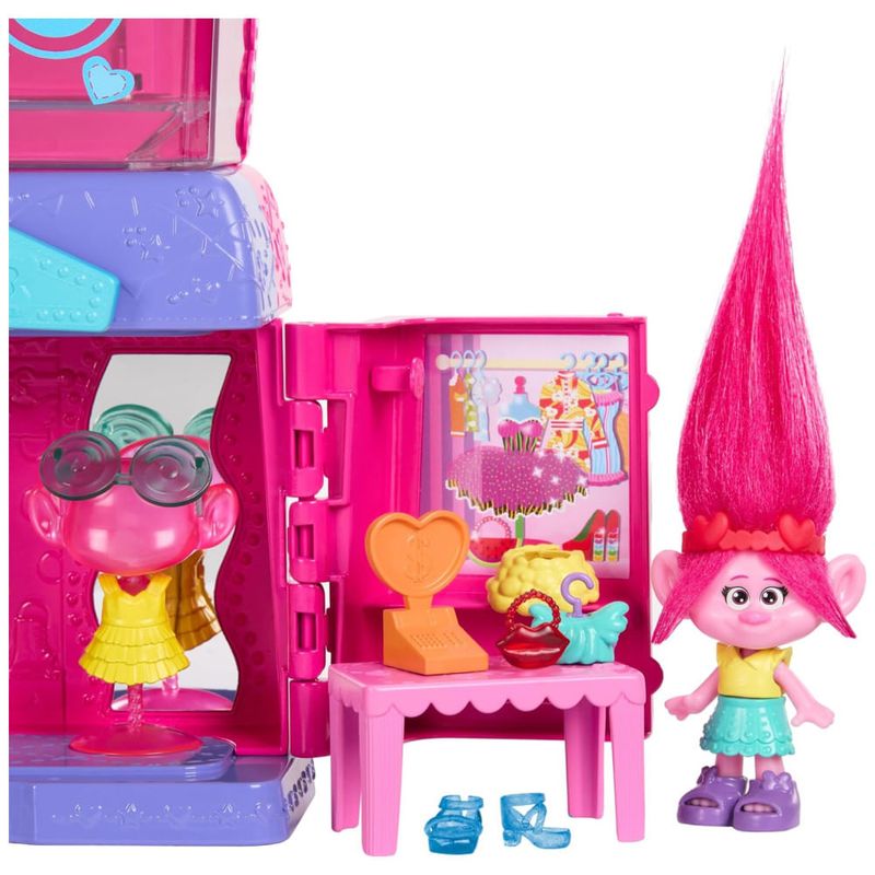 Transforme a diversão em estilo com o Conjunto DreamWorks Trolls Fairtastic Fashion Boutique e a boneca Queen Poppy!