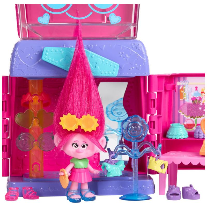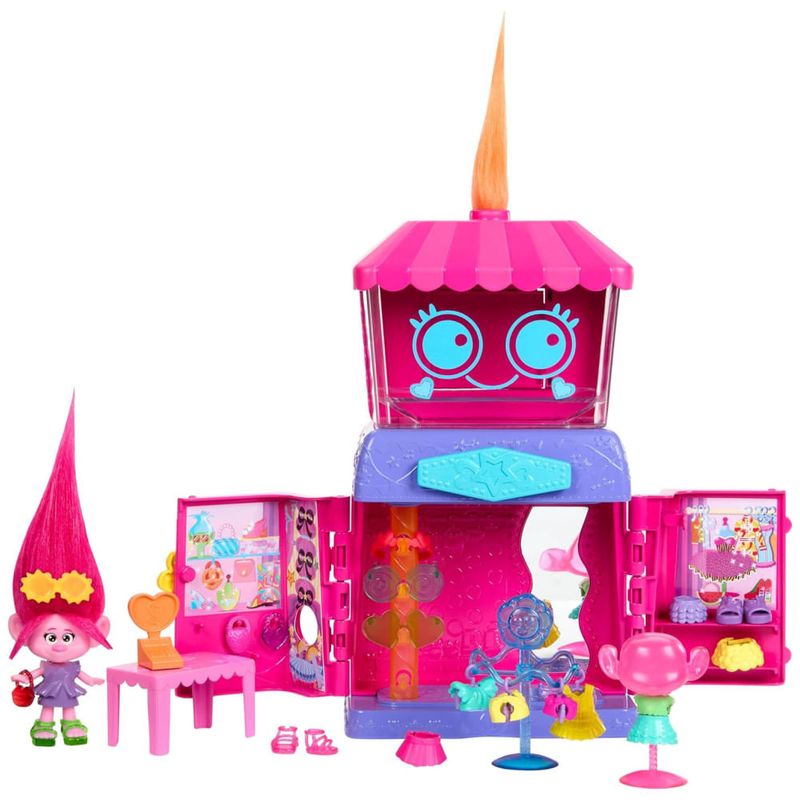 A boutique estimula a criatividade, permitindo decorar e organizar roupas e acessórios. Pendure os figurinos de Queen Poppy nas prateleiras de exposição, use o manequim Trolls para montar looks incríveis e deixe a imaginação fluir. O topo da boutique traz o icônico cabelo dos Trolls, adicionando um toque único ao design.