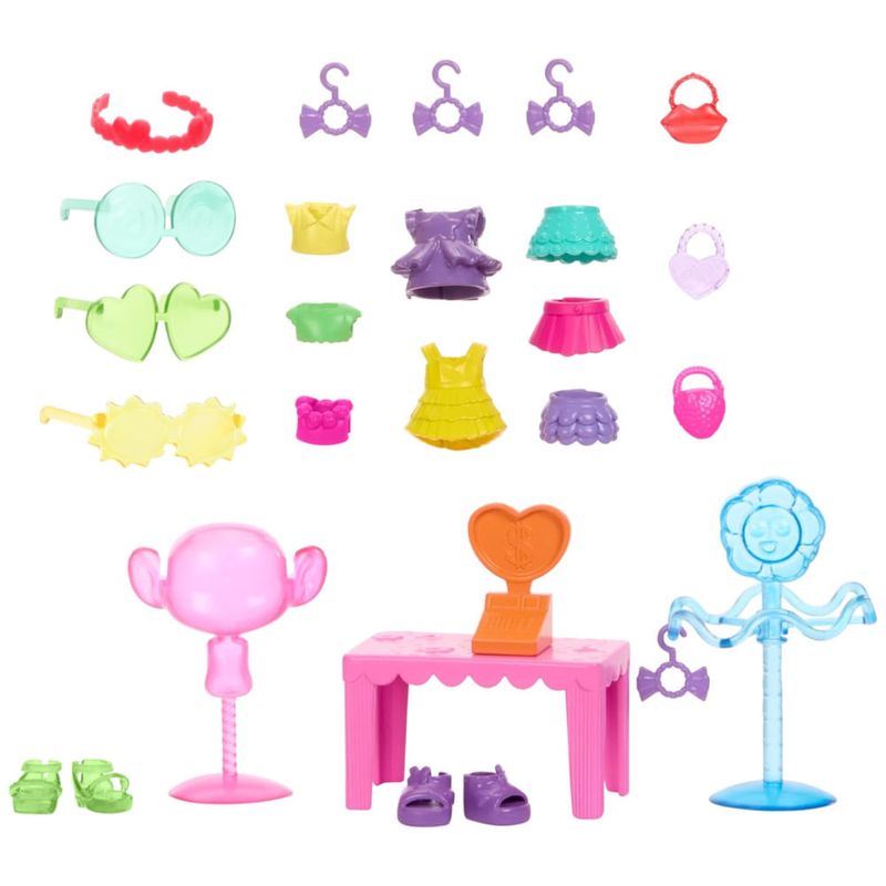 Com 25 peças inclusas, o conjunto é um universo de possibilidades: roupas, acessórios de moda e itens de narrativa como caixa registradora, suporte para óculos de sol e cabide. A boneca Queen Poppy está pronta para brilhar e se divertir em suas aventuras fashion.