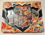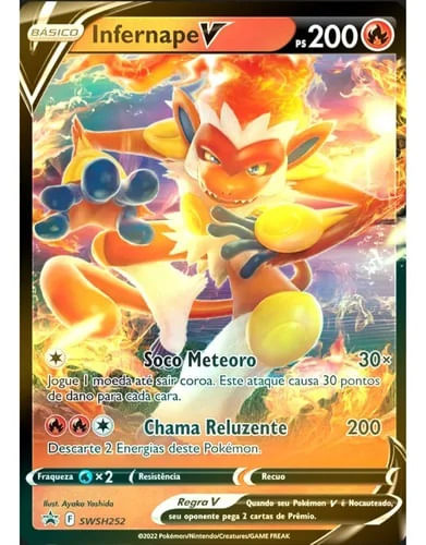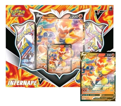 Incendeie a batalha com a agilidade e o poder de Infernape V! Continue jogando moedas com o ataque Soco Meteoro e, em seguida, faça o campo de batalha arder com o fogo de Chama Reluzente! Nesta coleção, você encontrará duas versões de Infernape V, uma jogável e outra extragrande, além de um bocado de pacotes de booster de Pokémon Estampas Ilustradas para melhorar seus baralhos e ajudar a completar sua coleção.