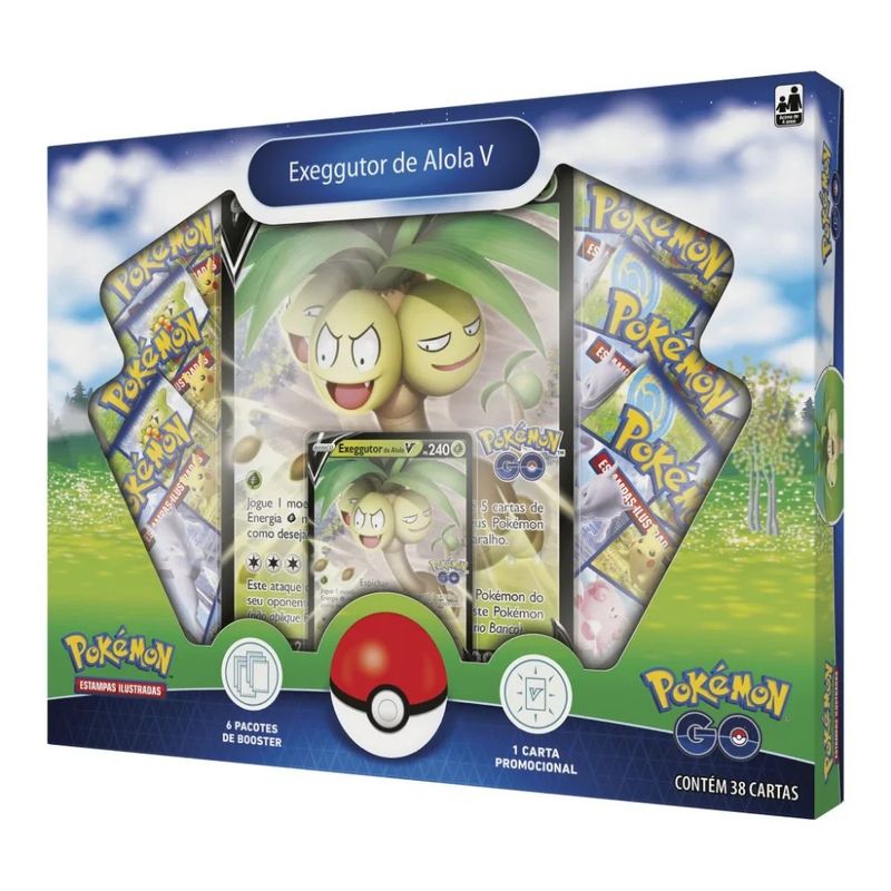 01 carta holográfica promocional de Exeggutror de Alola V 01 carta holográfica extra grande de Exeggutor de Alola V 06 pacotes de booster da expansão Pokémon Go 01 carta codificada para resgatar recompensas no Pokémon Go 01 carta codificada para o Pokémon Estampas Ilustradas Live