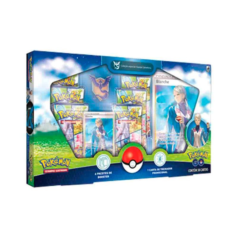 Cada Box vem com um lindo broche exclusivo com o emblema da equipe escolhida. A Box também acompanha 6 pacotes de booster da Expansão Pokémon GO, 1 carta codificada para resgatar recompensas no Pokémon GO e 1 carta codificiada para o Pokémon Estampas Ilustradas Live.