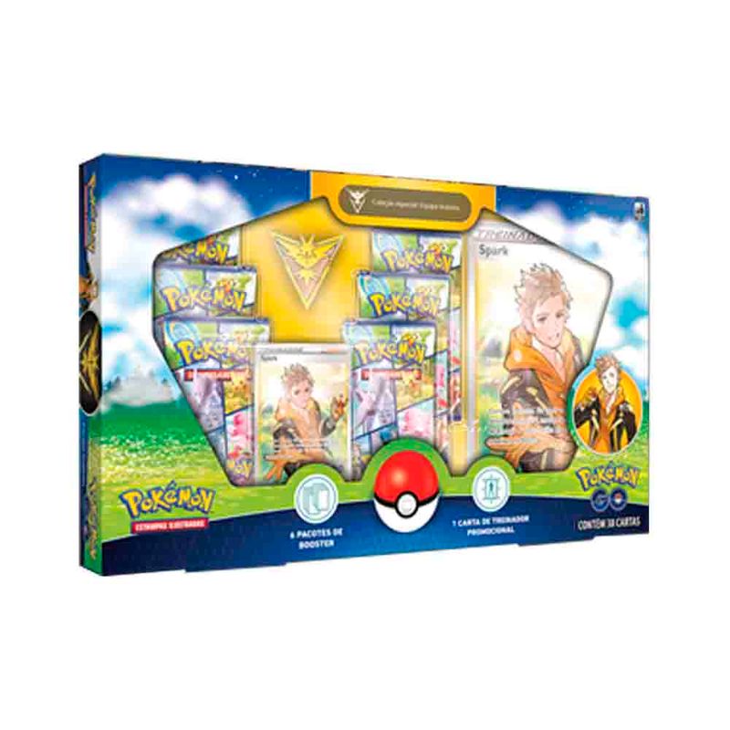 Cada Box vem com um lindo broche exclusivo com o emblema da equipe escolhida. A Box também acompanha 6 pacotes de booster da Expansão Pokémon GO, 1 carta codificada para resgatar recompensas no Pokémon GO e 1 carta codificiada para o Pokémon Estampas Ilustradas Live.