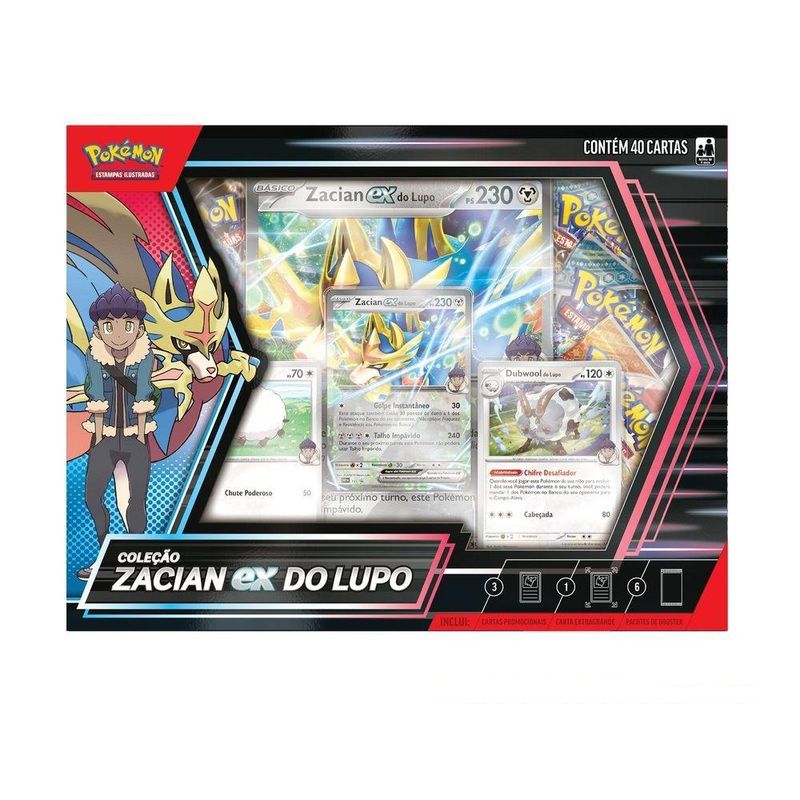Ficha Técnica:Marca: Copag;Nome do produto: Pokémon Box Zacian Ex do Lupo;Idade recomendada: A partir de 4 anos;Selo Inmetro: CE-BRI/INNAC-00276-01A - NM300/2002 - OCP 0061;Contém: 40 cartas.