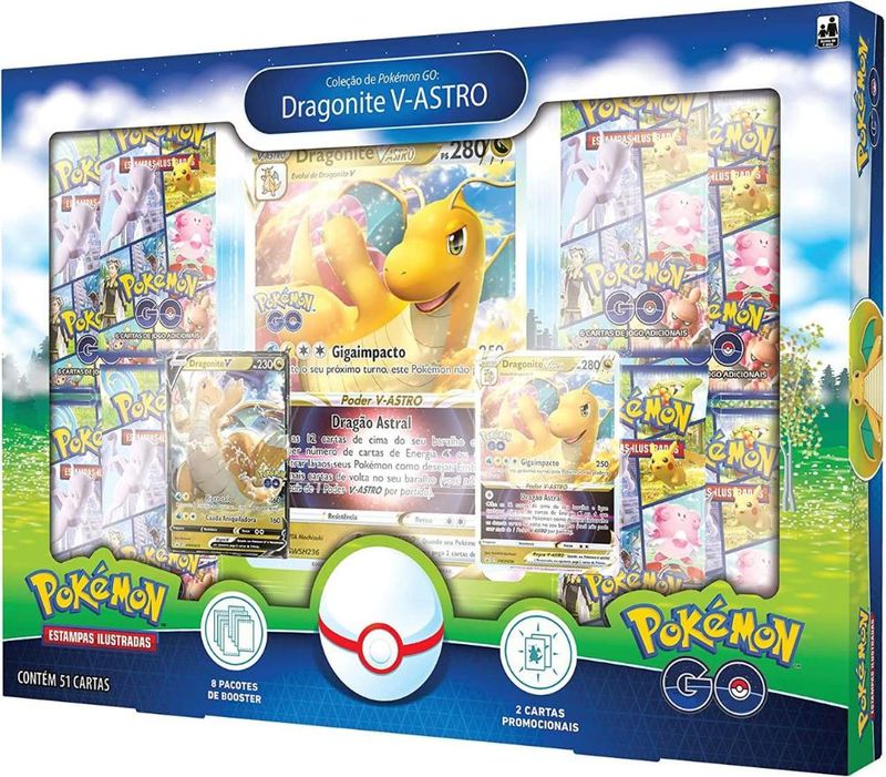 Contém: 1 carta holográfica promocional com textura especial de Dragonite V-ASTRO, 1 carta holográfica promocional de Dragonite V, 1 carta holográfica extragrande de Dragonite V, 8 pacotes de booster da expansão Pokémon GO, 1 carta codificada para resgatar recompensas no Pokémon GO, 1 carta codificada para o Pokémon Estampas Ilustradas Live