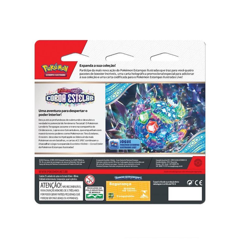 Diferenciais:Conjunto com cartas especiais de alta qualidade e poderes inéditos.Pokémon Lendário Terapagos e outros Pokémon ex Tera Estelares que prometem emocionantes batalhas.Cartas ACE SPEC que adicionam novas estratégias ao jogo.Design exclusivo e colecionável da expansão Escarlate e Violeta - Coroa Estelar.