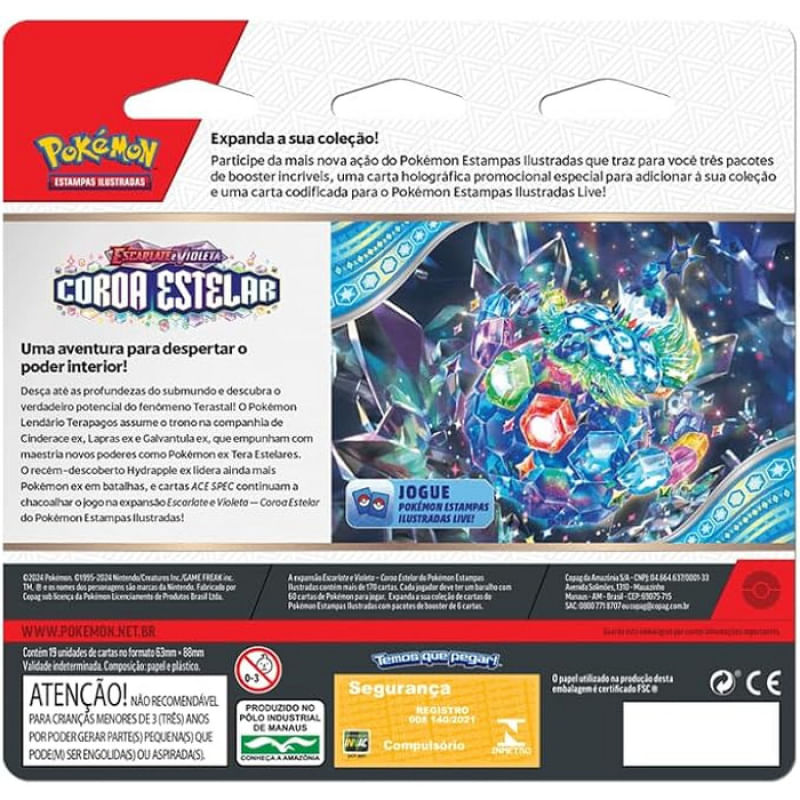 Conteúdo do Produto3 pacotes de booster da coleção Coroa Estelar, cada um contendo 6 cartas, totalizando 18 cartas.1 carta promocional holográfica especial (variando entre Porygon2 ou Horsea, dependendo da versão adquirida).1 carta codificada para o Pokémon Estampas Ilustradas Live.Total de 19 cartas no formato padrão 63 mm x 88 mm.