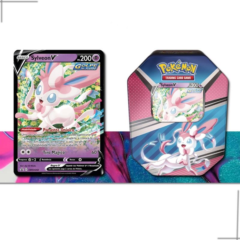 - Cada lata vem com uma carta Pokémon especial de Espeon V SWSH201, Sylveon V SWSH202 ou Umbreon V SWSH203;
