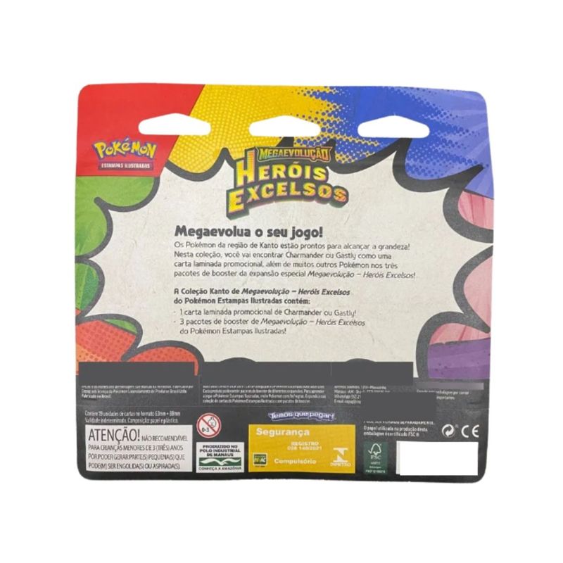 Os Pokémon da região de Kanto estão prontos para alcançar a grandeza! Nesta coleção, você vai encontrar Charmander ou Gastly como uma carta laminada promocional, além de muitos outros Pokémon nos três pacotes de booster da expansão especial Megaevolução - Heróis Excelsos!