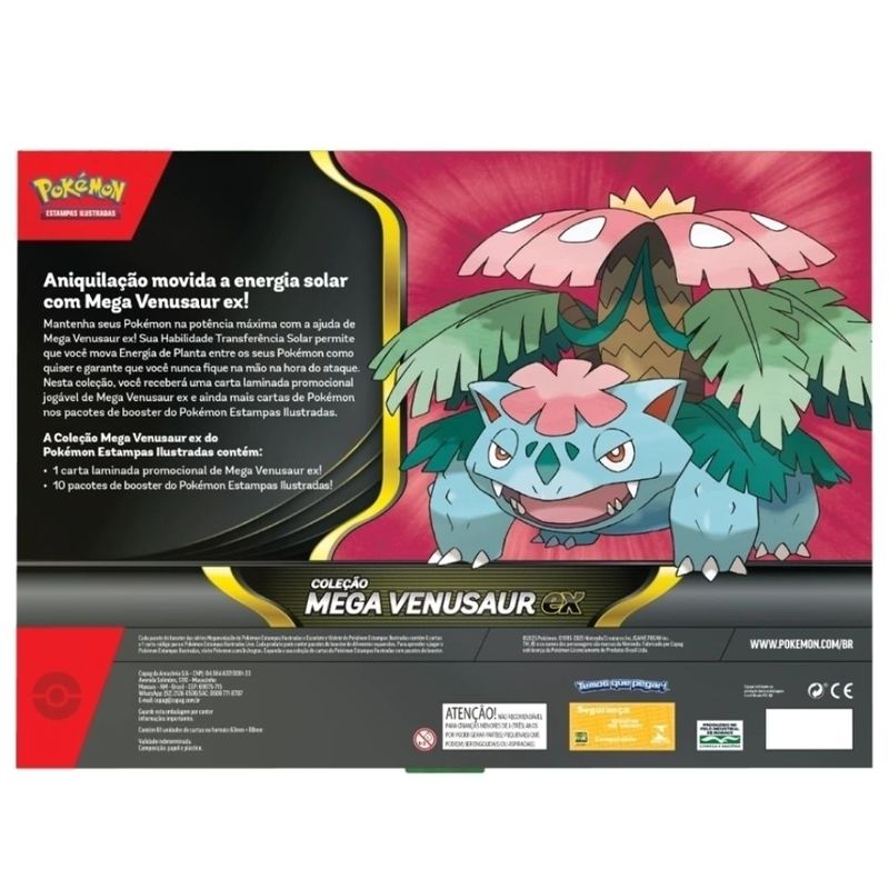 Nesta coleção, você receberá uma carta laminada promocional jogável de Mega Venusaur ex e ainda mais cartas de Pokemon nos pacotes de booster do Pokemon Estampas Ilustradas.