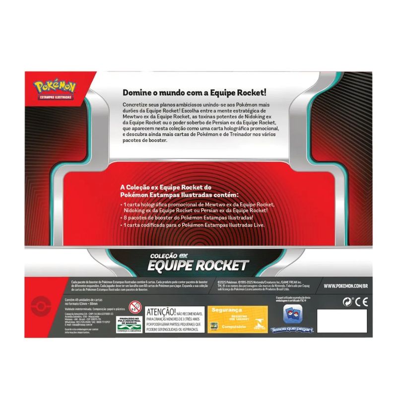 Escolha entre a mente estratégica de Mewtwo ex da Equipe Rocket, as toxinas potentes de Nidoking ex da Equipe Rocket ou o poder soberbo de Persian ex da Equipe Rocket, que aparecem nesta coleção como uma carta holográfica promocional, e descubra ainda mais cartas de Pokémon e de Treinador nos vários pacotes de booster.