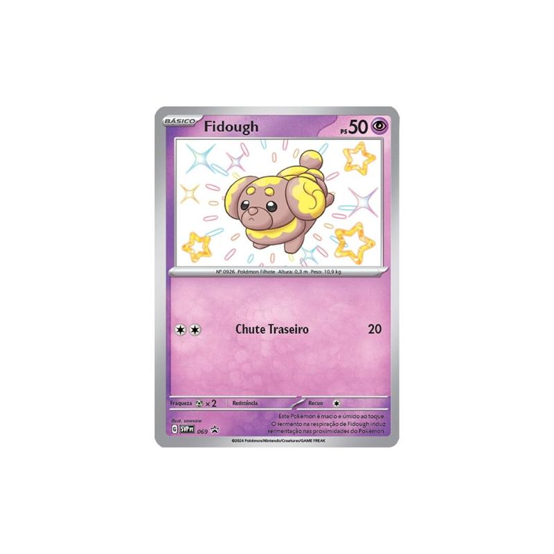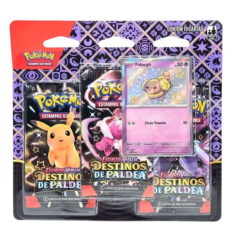 Contém 19 unidades de cartas no formato 63mm x 88mm. O (Blister triplo do Fidough Brilhante) Contém: 1 unidade de blister triplo com a carta promocional do Fidough Brilhante; Cada pacote de booster de Escarlate e Violeta - Destinos de Paldea do Pokémon Estampas Ilustradas contém 6 cartas.