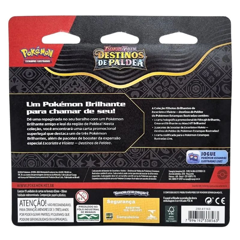 Contém 19 unidades de cartas no formato 63mm x 88mm. O (Blister triplo do Fidough Brilhante) Contém: 1 unidade de blister triplo com a carta promocional do Fidough Brilhante; Cada pacote de booster de Escarlate e Violeta - Destinos de Paldea do Pokémon Estampas Ilustradas contém 6 cartas.