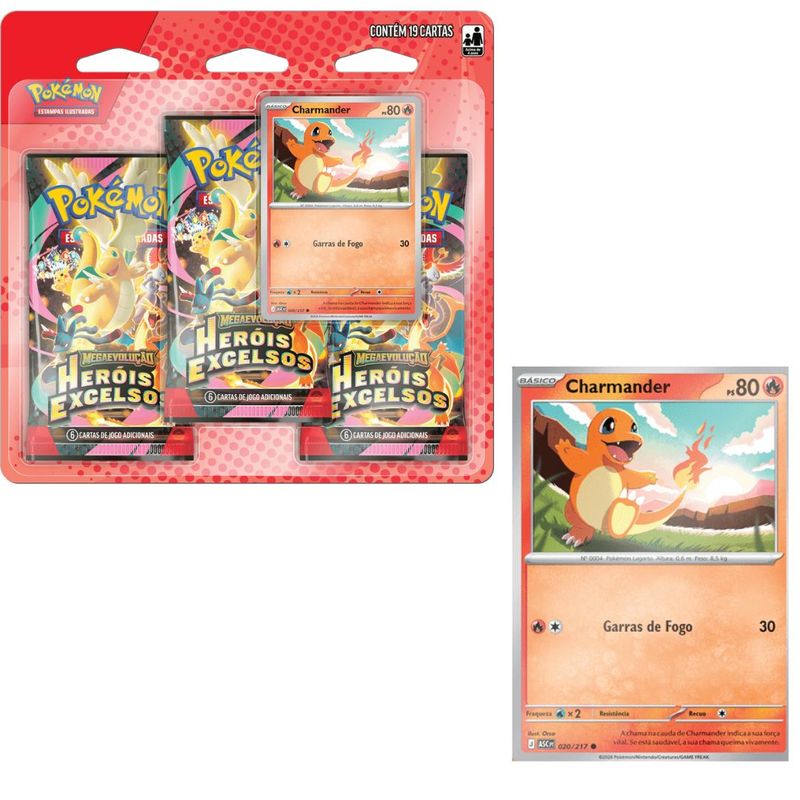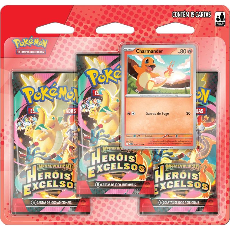 Nesta coleção, você vai encontrar Charmander ou Gastly como uma carta laminada promocional, além de muitos outros Pokémon nos três pacotes de booster da expansão especial Megaevolução Heróis Excelsos!
