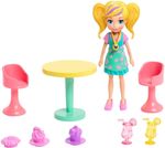A boneca Polly está super atarefada com guloseimas como sorvete, cupcakes, cachorros-quentes, pizzas e smoothies. Há uma fila se formando e Polly está pronta para servir seus clientes famintos.