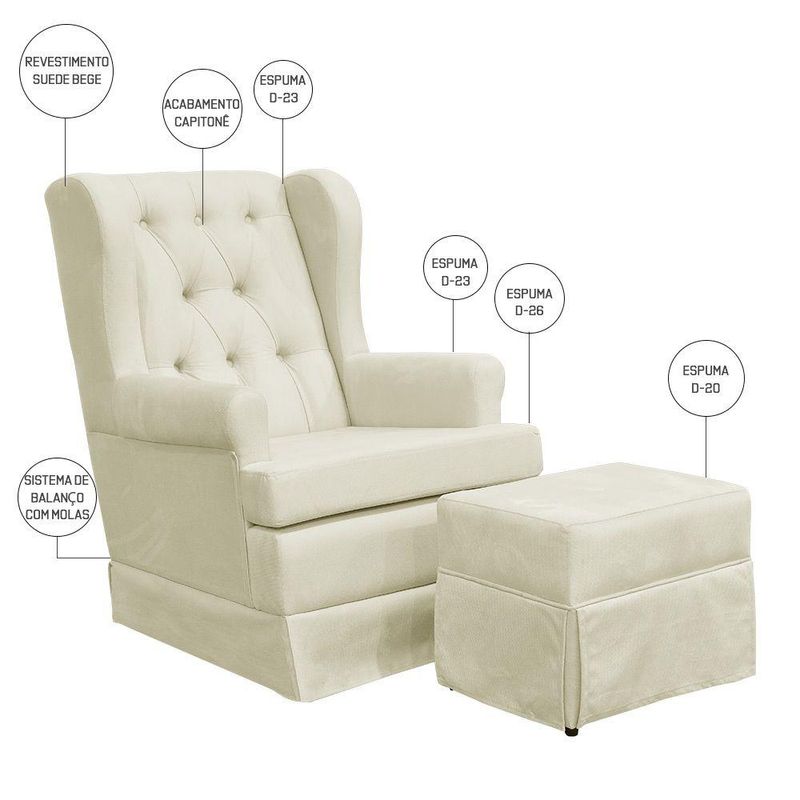 Descrição do produto: A hora da amamentação é um momento de incrível conexão da mãe com o bebê. Nesta nova e desafiante fase, a poltrona de amamentação ideal faz total diferença para que flua naturalmente e atenda todas as necessidades, deixando a mãe e o bebê extremamente confortáveis. Possui mecanismo de balanço, é o movimento da poltrona é uma opção funcional para ajudar a acalmar o bebê. Para a mãe, previne possíveis dores ou desconforto na hora de amamentar, além da altura ser ideal para que levante da poltrona sem dificuldades, e também sem acordar o seu pequeno. O puff é um componente aliado para o conforto dos pés, detalhe que faz total diferença.