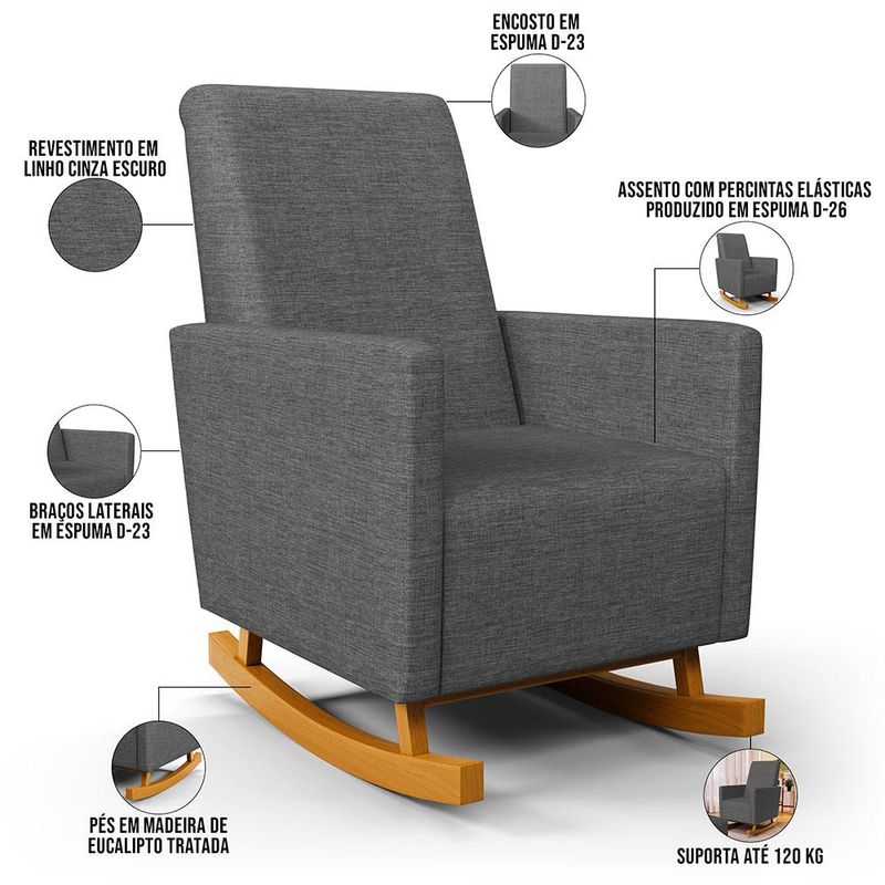 Desfrute de momentos especiais de amamentação e relaxamento com a Poltrona de Amamentação com Balanço e Puff Ravena Linho Cinza Escuro, da Lyam Decor. Fabricada com estrutura em madeira de eucalipto tratada e os pés balanço estilo canoa, esse modelo proporciona estabilidade e segurança, permitindo que você se entregue ao conforto absoluto durante esse tempo de vínculo entre mãe e filho. Além disso, o design moderno e elegante dessa poltrona de balanço é perfeito para mamães que buscam o máximo de conforto para si e para o bebê, uma vez que a poltrona conta com assento tapeçado com espuma D-26 e o encosto e braças D-23. Já o puff serve de apoio extra para os pés durante esse período, garantindo uma experiência de amamentação tranquila e aconchegante.