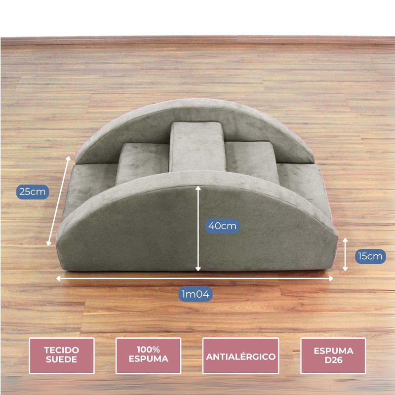 A Ponte de Degraus Suede é um circuito modular pensado para unir diversão, segurança e desenvolvimento infantil. Fabricada em espuma de alta densidade e revestida com tecido suede lavável, antialérgico e macio ao toque, ela garante conforto e acabamento sofisticado, ideal para ambientes que exigem beleza e funcionalidade. Composta por 7 peças – 5 degraus (1 central maior, 2 médios e 2 menores) e 2 laterais – a ponte estimula o equilíbrio, a coordenação motora e a força muscular de forma lúdica. As laterais oferecem apoio seguro para mãos e pés, tornando a atividade mais estável e divertida. Perfeita para casas, creches, escolas e clínicas de psicomotricidade, a Ponte de Degraus Suede se encaixa em diferentes propostas pedagógicas e recreativas. Dimensões totais: Comprimento: 1m04 Largura: 62cmAltura: 38 a 40cm (ponto mais alto) Dimensões das laterais: Comprimento: 1m04 Largura: 10cm Altura: 40cm Material: Espuma de alta densidade + tecido suede lavável e antialérgico Idade recomendada: 1 a 6 anos Benefícios Desenvolve equilíbrio e coordenação motora Fortalece braços e pernas Montagem simples e rápida Design modular e seguro Acabamento premium em tecido suede