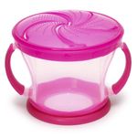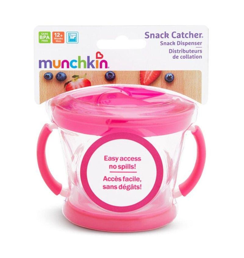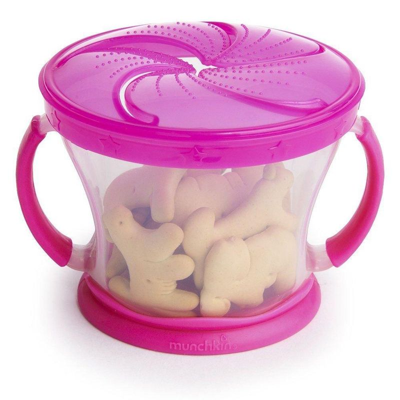 O Porta Biscoito Munchkin possui alças emborrachadas e abas macias o suficiente para que a criança pegue o alimento sem dificuldades com segurança e sem risco de derramar. A parte debaixo é emborrachada, para que o pote não escorregue na mesa. Na parte de baixo há um espaço para colocar o nome da criança, perfeito para escola, passeios e viagens.