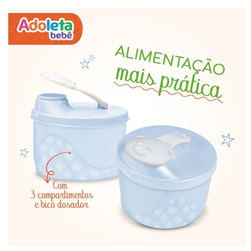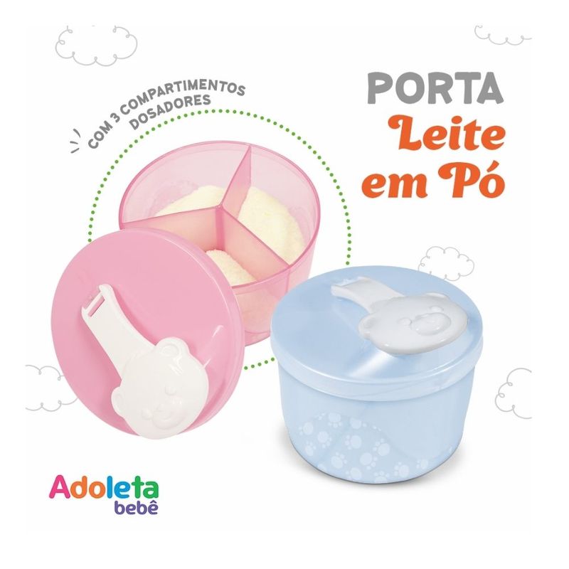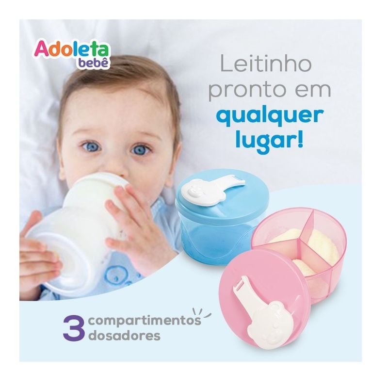 Com 3 compartimentos e bico dosadores, o Porta-Leite em Pó Adoleta Bebê é ideal para o armazenamento correto do leite em pó. Ideal para ser levado em viagens e passeios.