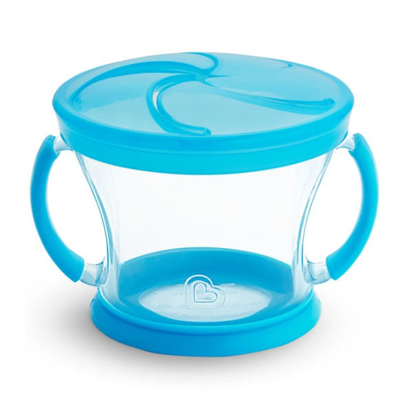 O Porta Biscoito Munchkin possui alças emborrachadas e abas macias o suficiente para que a criança pegue o alimento sem dificuldades com segurança e sem risco de derramar. A parte debaixo é emborrachada, para que o pote não escorregue na mesa. Na parte de baixo há um espaço para colocar o nome da criança, perfeito para escola, passeios e viagens.
