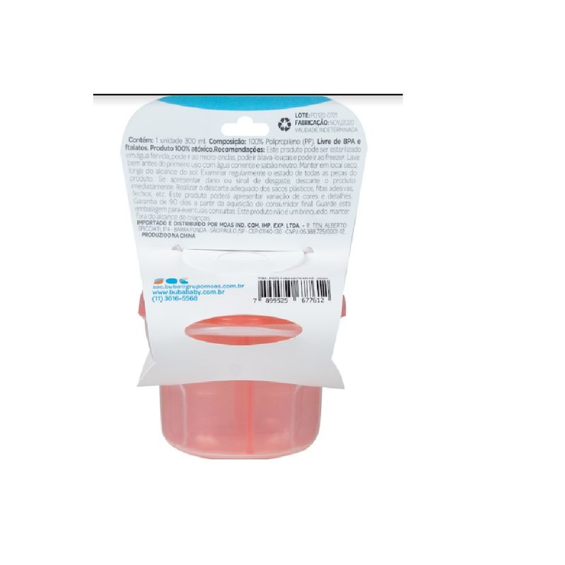 O Pote dosador de leite em pó da Buba possui 3 divisórias, com parte interna removível, para facilitar a sua limpeza, como também, pode ser usado como pote para alimentos. Possui bico com tampa, oferecendo maior praticidade. Com capacidade para 300 ml. Ideal para levar em passeios e viagens.