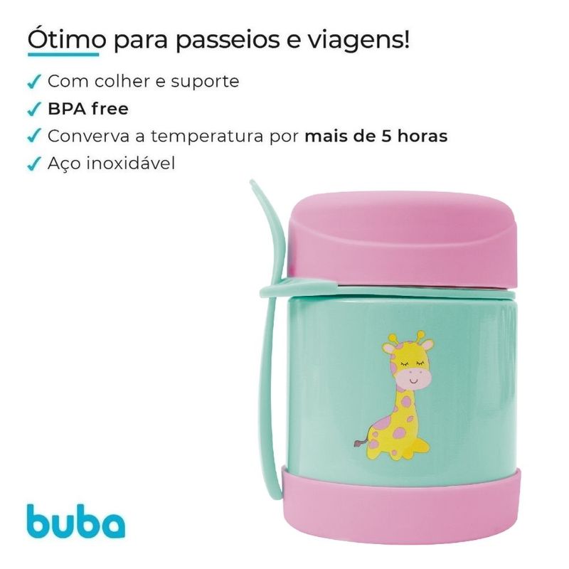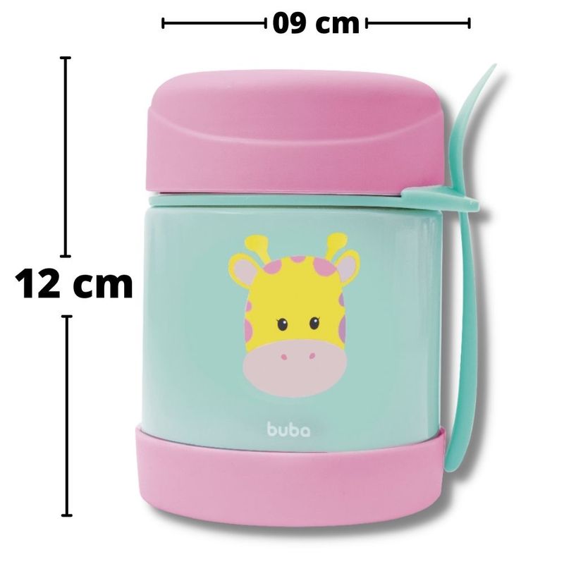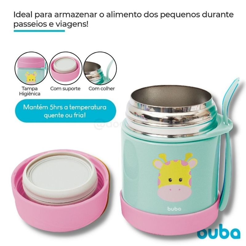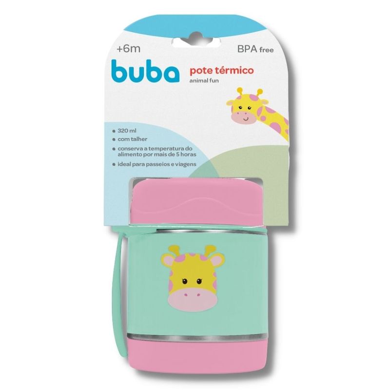 - O Pote Térmico Animal Fun da Buba acompanha talher e é ideal para refeições fora de casa, pois ajuda a conservar a temperatura dos alimentos (quente ou fria) por até 5 horas. Pode ser utilizado para armazenar papinhas, frutas e legumes. Produzido em aço inoxidável com parede dupla, e resistente e higiênico. Perfeito para levar em passeios e viagens.