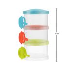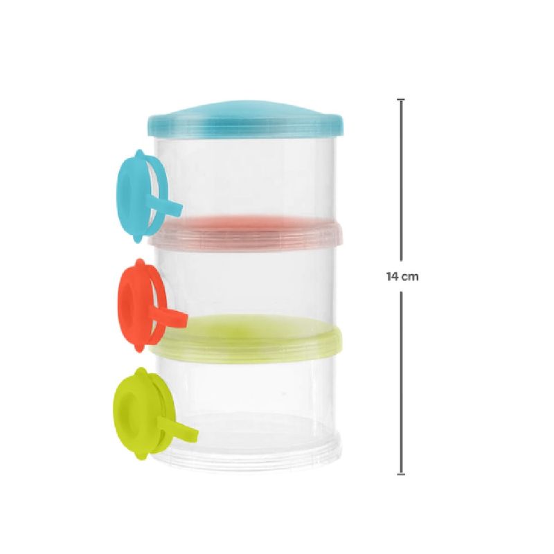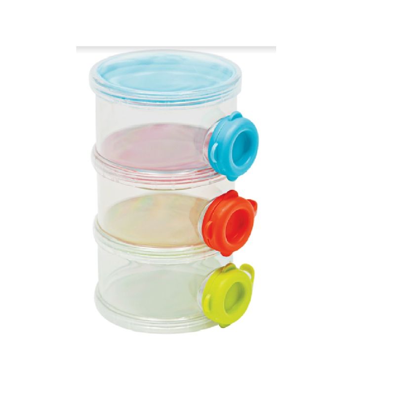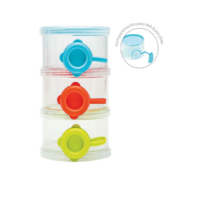 São 3 potes com tampinhas coloridas e muito práticos podendo ser levados a qualquer lugar, com capacidade para 3 porções de leite em pó para a mamadeira de seu bebê. Também para petiscos! De fácil transporte, para facilitar a vida dos pais!