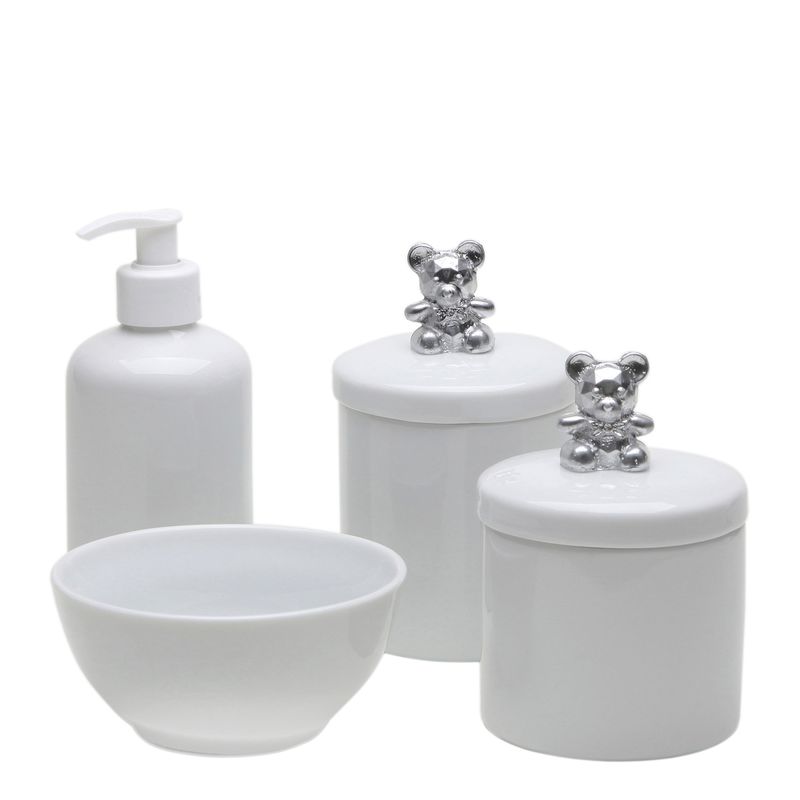 Kit higiene com porcelanas brancas decoradas com ursinho prata.