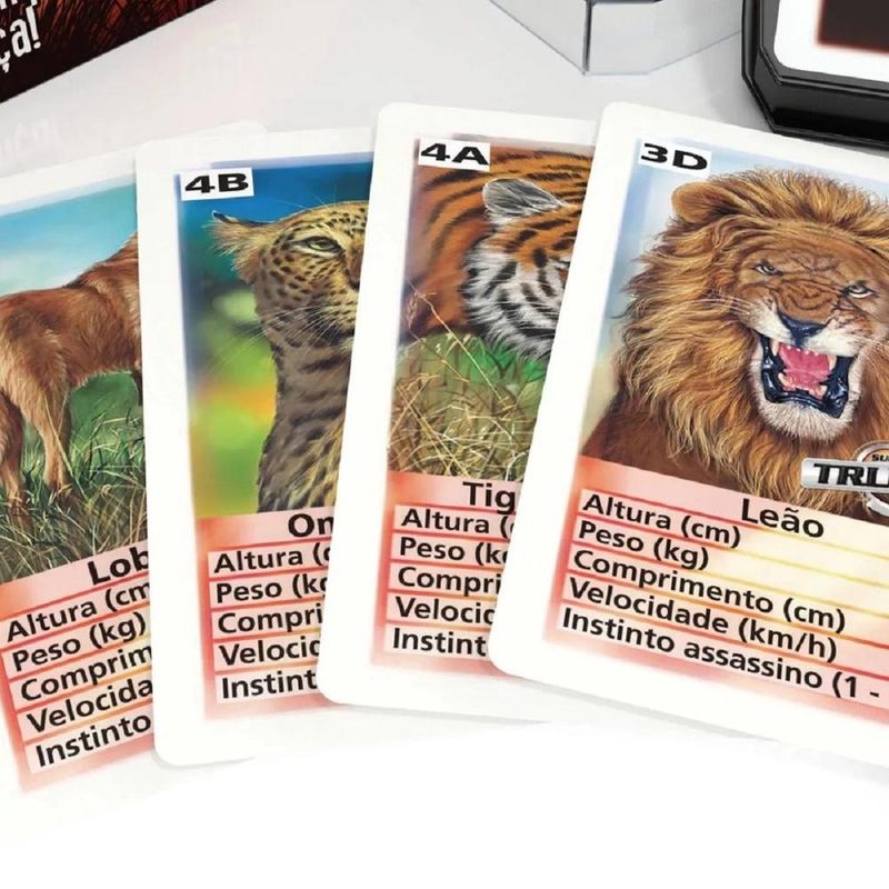 Super Trunfo Predadores traz 32 cartas com ilustrações e informações sobre os maiores e mais ferozes predadores do mundo animal. Em qual item o predador da sua carta é o melhor? Será em altura? Em velocidade? Ou você tem o Super Trunfo? Escolha, compare e vença esta emocionante disputa! Dimensões da Aproximadas da Embalagem: 15,2 x 10 x 2 cm Idade recomendada: 7+; Composição/Material: Papel; Funciona com pilhas: Não; Brinquedo com luz: Não; Brinquedo com som: Não; Dimensões: 10x15x2 cm; Peso: 0,37 kg; Código de Barras: 7908010116298; Garantia do Fornecedor: 3 Meses contra defeito de fabricação;