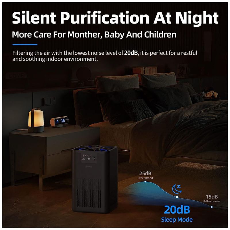 Operação de baixo ruído de 20dB ative o modo de suspensão do purificador, o ventilador será reduzido para a velocidade mais baixa. Você ficará surpreso com o efeito silencioso do purificador, mas o purificador está realmente funcionando. Filtre o ar com o menor ruído de 20dB, proporcionando um espaço silencioso.