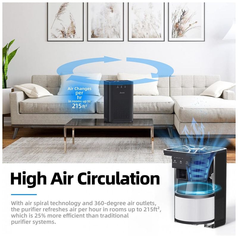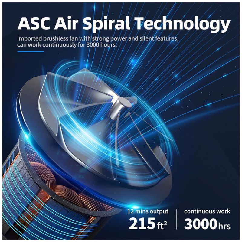 Alta taxa de circulação com tecnologia em espiral de ar e saídas de ar de 360 graus, o purificador refresca o ar 5 vezes por hora em salas de até 215 pés quadrados , 20 metros quadrados, o que é de 25 mais eficiente que os sistemas purificadores tradicionais. Não deixando canto intocado, protegemos sua saúde.