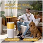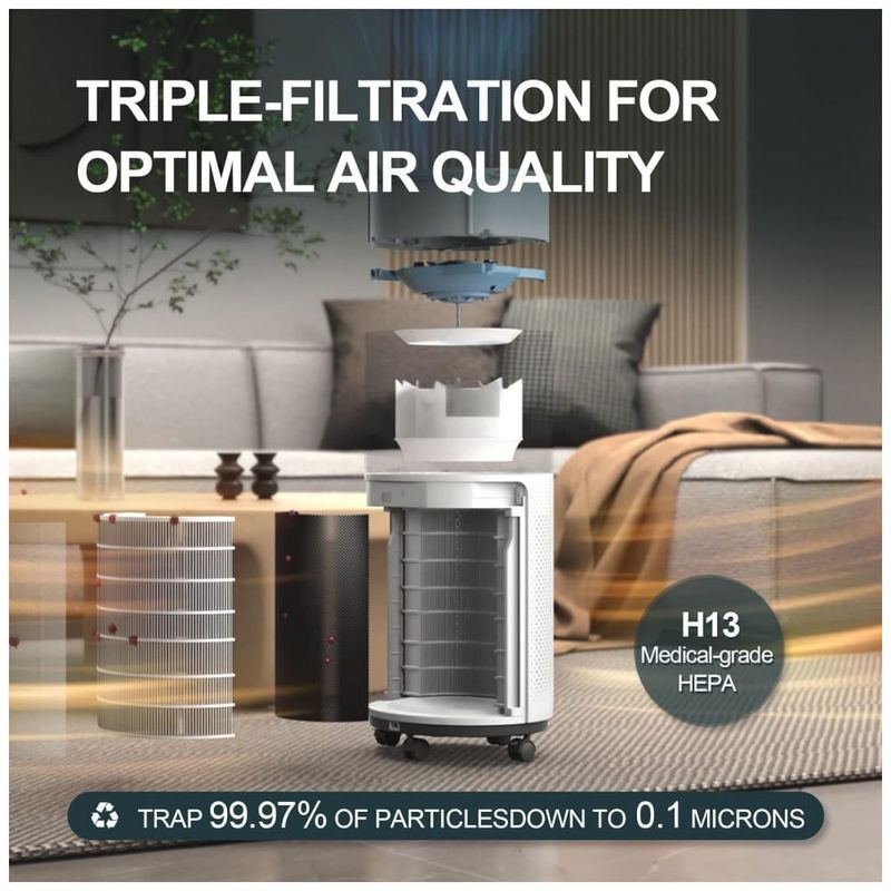 TECNOLOGIA DE FILTRO TRIPLO Nosso purificador de ar doméstico vem do com um sistema de filtragem tripla, tornando o o melhor purificador de ar para poluentes domésticos Pre Filter coleta objetos maiores, como cabelo, pólen, pêlos de animais e fiapos O filtro H13 True HEPA retém 99,97 das partículas, poeira, como pm10, pm2,5, bactérias e vírus enquanto um Filtro de Carvão Ativado iMACT absorve fumaça de incêndio florestal, cozinha e odores de animais de estimação e VOCs.