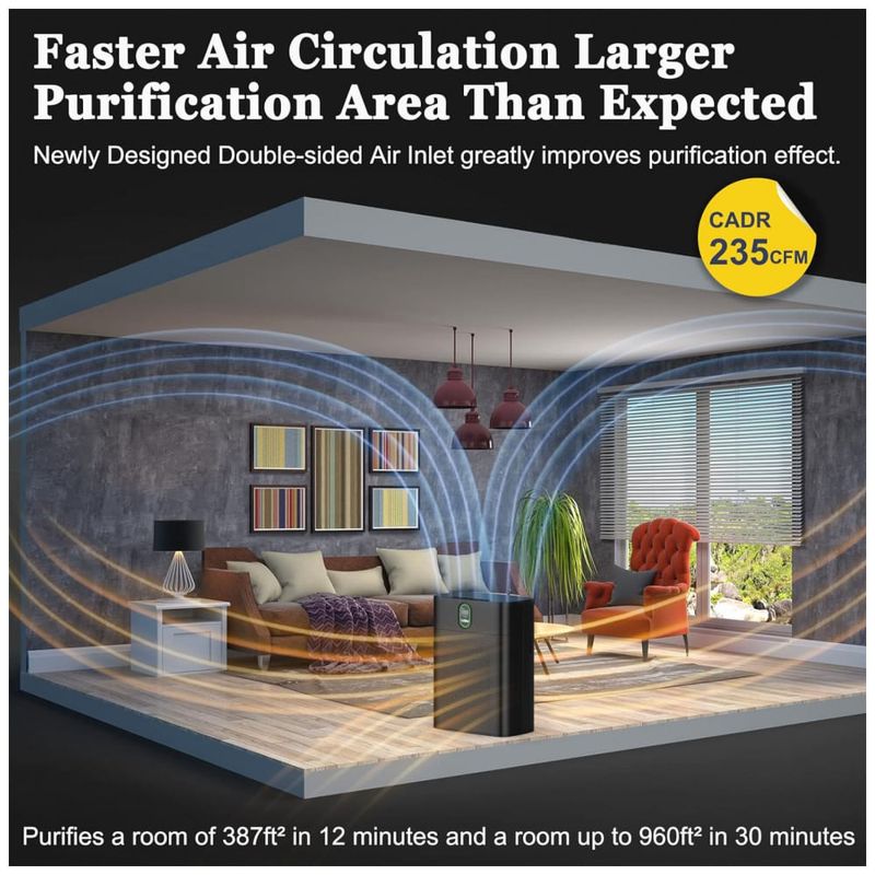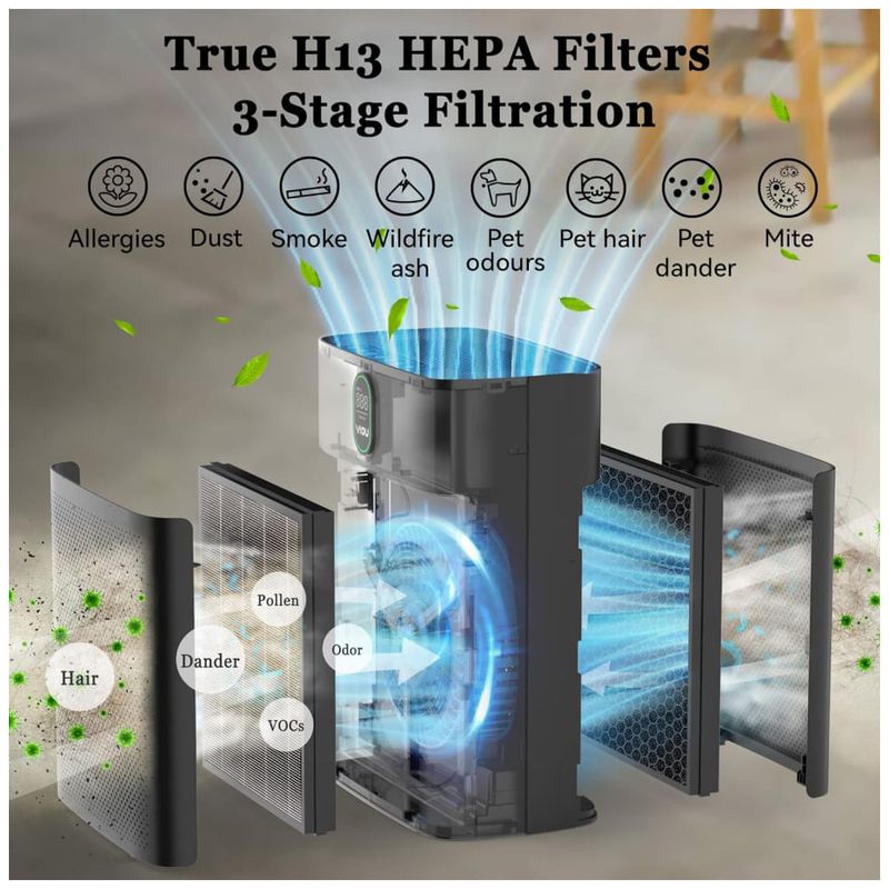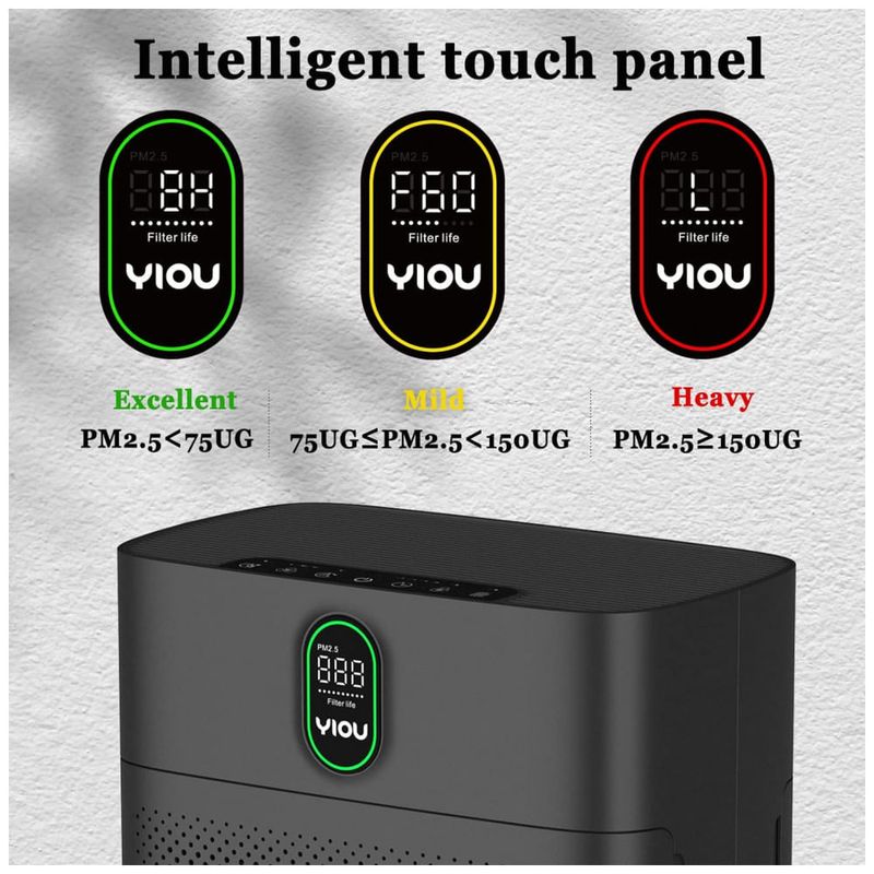 Filtros de ar duplos e exibição de porcentagem de vida útil do filtro O purificador de ar YIOU M1 é construído com entradas duplas de quase 360 e funciona com 2 filtros de ar H13 HEPA verdadeiros que podem bloquear poluentes transportados pelo ar de até 0,3 m de diâmetro. Particularmente, a perda de vida útil do filtro é mostrada claramente na tela de LED.
