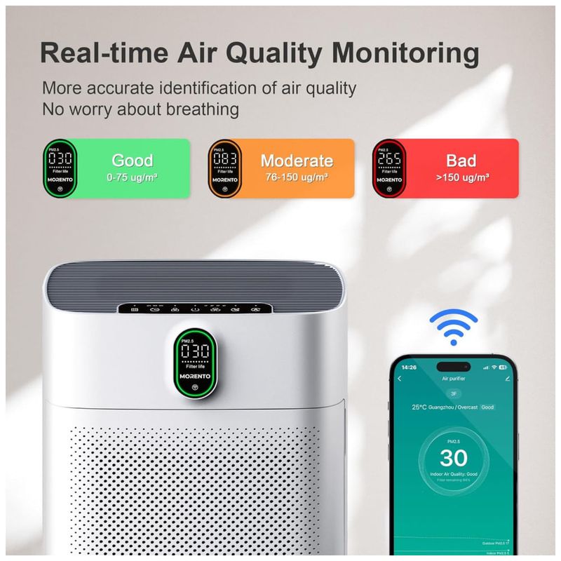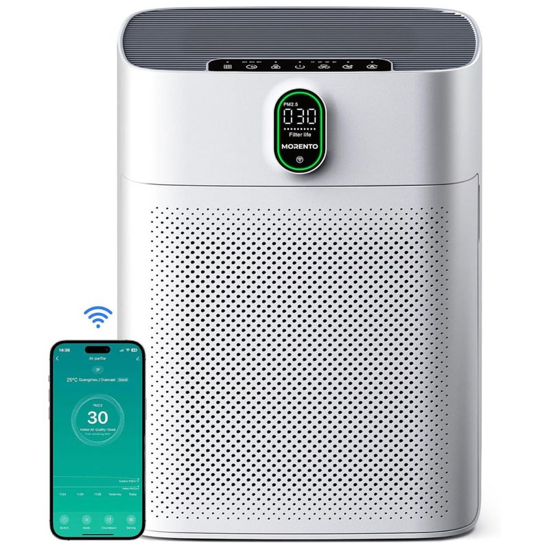 Os purificadores de ar inteligentes MORENTO HY4866WF são ideais para quem deseja um ar limpo em casa. Eles capturam eficazmente partículas transportadas pelo ar, incluindo poeira e pólen, com tamanho de 0,3 mícron. Com um CADR de até 300 m h, esses purificadores podem ser usados em salas grandes de até 327,05 metros ou 100 m. É possível monitorar a qualidade do ar em tempo real pelo aplicativo Havaworks. Além disso, os purificadores podem ser controlados remotamente pelo aplicativo ou por voz, através do Amazon Alexa ou do Google Assistant. O design de entrada de ar dupla permite que os filtros HEPA multicamadas purifiquem de ambos os lados simultaneamente, aumentando a velocidade de purificação. A vida útil do filtro pode ser monitorada pelo display inteligente ou pelo aplicativo. No modo de suspensão, o purificador funciona na velocidade mais baixa do ventilador, com menos de 24,0 DB, permitindo uma noite de sono tranquila. Há quatro velocidades do ventilador disponíveis e um temporizador de 258 horas para programar o tempo de funcionamento desejado. O sensor infravermelho PM2.5 monitora a qualidade do ar em tempo real e exibe as informações na tela do purificador e no aplicativo Havaworks. Em caso de queda na qualidade do ar, o display exibe amarelo ou vermelho e o aplicativo envia uma notificação correspondente. Para adquirir filtros de reposição, procure pelos modelos B0BMDYDXFK aprimorado ou B0C3GWNR29 original na Amazon.