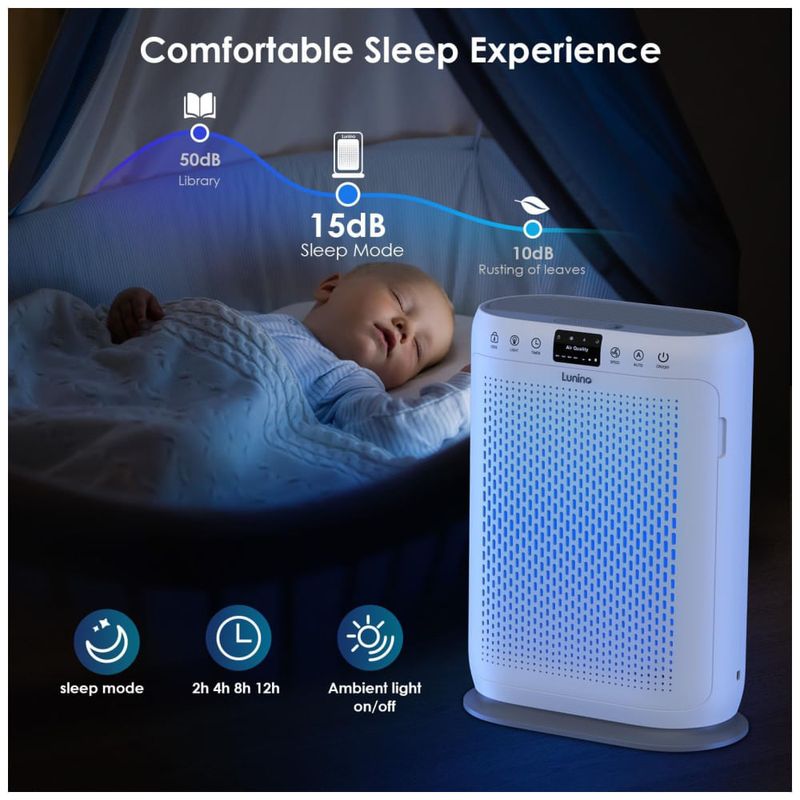 Este purificador conta com 5 modos de velocidade do ventilador, incluindo o modo "Sleep", que é super silencioso, operando com um nível de ruído tão baixo quanto 15 dB. Para garantir uma noite tranquila, você pode desligar a luz noturna suave.