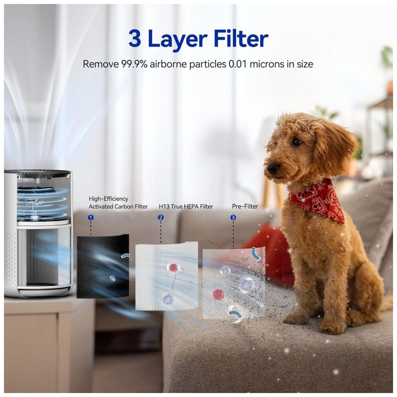 Equipado com um filtro HEPA verdadeiro H13 e um sistema de filtragem de 3 estágios, ele remove 99,9% das partículas transportadas pelo ar com tamanhos de até 0,01 mícron, proporcionando um ar mais limpo e saudável. No modo de espera, opera quase em silêncio, com apenas 20 dB, tornando-o ideal para crianças, idosos e para ambientes onde a tranquilidade é essencial.