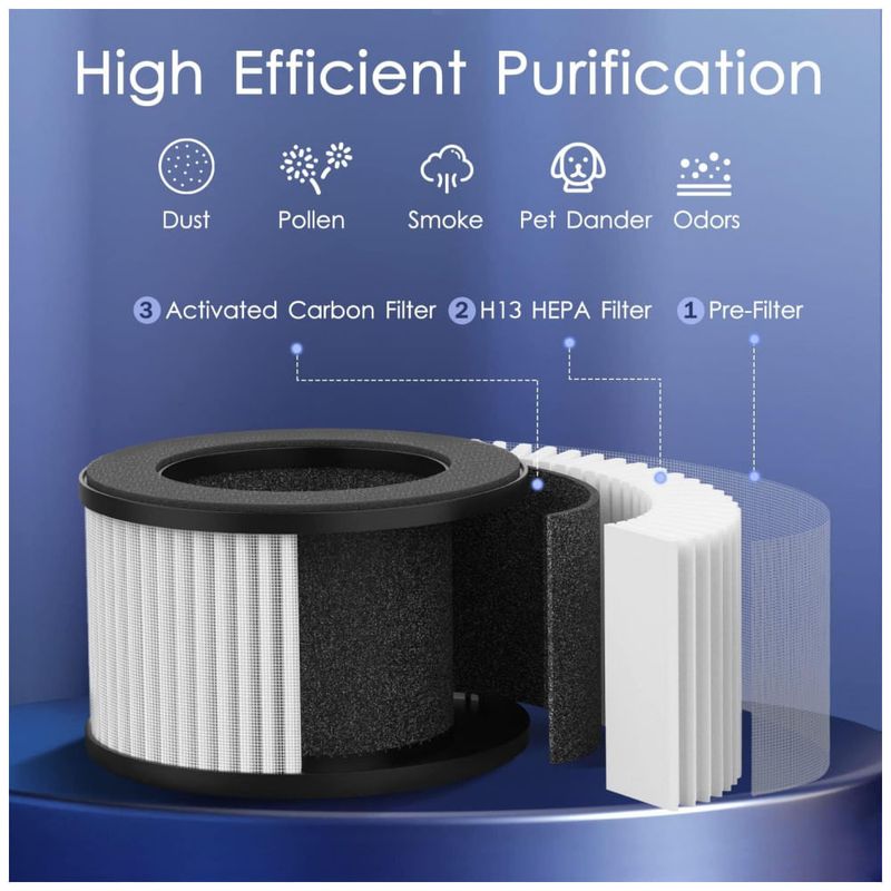OPERAÇÃO DE BAIXO RUÍDO 15 dB: Este pequeno purificador de ar opera com apenas 15 dB no modo de suspensão. A luz do botão na tela se apaga no modo de suspensão após os 10 anos de operação, permitindo que você desfrute de um descanso tranquilo. Além disso, você também pode ligar a luz ambiente noturna e escolher um temporizador de 2, 4, 6, 8 horas.