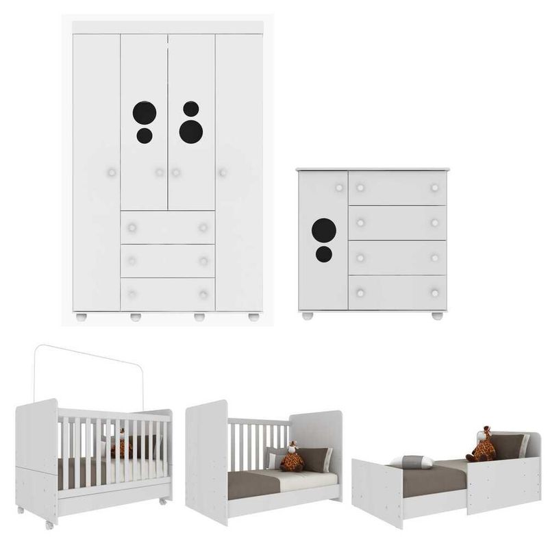 Transforme o quarto do seu bebê em um ambiente acolhedor e funcional com o Quarto Infantil Pimpolho Multimóveis. Produzido em MDP/MDF com acabamento acetinado, proporcionando cerca de 20% de brilho, este conjunto é perfeito para quem busca qualidade e sofisticação. O guarda-roupas com 4 portas e 3 gavetas oferece espaço suficiente para acomodar todas as roupas do bebê. A cômoda possui 1 porta com prateleira e cabideiro, além de 4 gavetas espaçosas. E não se preocupe quanto à segurança: a cômoda acompanha kit com sistema antitombamento. Com detalhes em vidro incolor nas portas, o ambiente fica com um toque elegante. O Berço Americano 3 em 1 é perfeito para garantir o conforto e a segurança do seu bebê. Certificado pelo INMETRO, é produzido em MDP com acabamento em pintura UV e Laca PU que garantem durabilidade e resistência. O diferencial deste produto está na sua versatilidade: além de ser um berço padrão americano (tamanho do colchão 130 x 70cm) superconfortável, ele também se transforma em sofá e minicama, acompanhando o crescimento da criança. Pensando no bem-estar do seu pequeno, este berço possui grade Soft (PVC) ecologicamente correta, elaborada com matéria-prima livre de metais pesados, atóxica e com proteção anti-amarelamento. Além disso, conta com suporte para mosquiteiro que protege o bebê dos insetos indesejáveis durante as noites de sono. O colchão D18 incluso oferece tratamento anti-ácaro e anti-alérgico para maior tranquilidade dos pais. Com lastro do colchão ajustável em 5 diferentes alturas, você pode regular conforme a necessidade do momento ou fase da criança. E não podemos esquecer dos práticos rodízios que facilitam a movimentação do móvel pelo ambiente. Suporta até 50kg e é certificado pelo INMETRO sob o Selo n° 005770/2018.