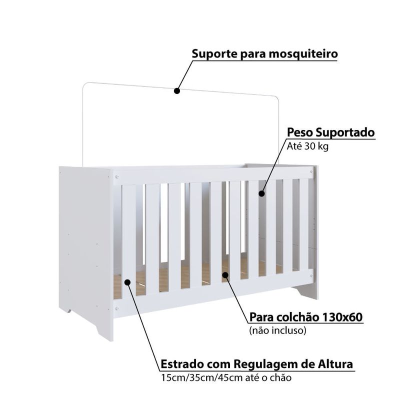 O Quarto de Bebê Aconchego, como o próprio nome diz, proporciona aconchego ao bebê e ao ambiente. Conjunto Completo IV, com Berço Mini Cama 3 em 1, Cômoda e Guarda Roupa. Berço com 3 regulagens de altura, Guarda Roupa com 3 portas, 2 gavetas e Cômoda de 4 gavetas e 1 porta. Versáteis, os móveis são de fácil combinação com diversos tipos de decoração e podem ser montados separados.