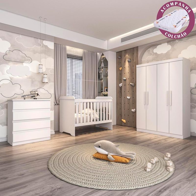A Carolina Baby é uma empresa especializada na fabricação exclusiva de móveis infantis com o selo de qualidade do INMETRO. O quarto conta com um espaçoso guarda roupa, com estrutura em MDP e portas de correr sobre trilhos metálicos. Tanto o roupeiro quanto a cômoda tem as gavetas equipadas com corrediças metálicas, garantindo mais segurança e qualidade no produto. O berço 3 em 1 feito em MDP MDF também pode ser aproveitado como mini-cama e mini-sofá. Estes produtos se encontram disponíveis nas cores Branco Brilho.