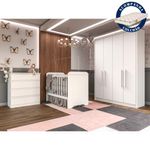 O dormitório perfeito para combinar com a decoração que você escolheu para acolher o seu baby. Produzidos em MDP MDF de alta resistência mecânica, nossos móveis são feitos para durar. Por trás das portas deslizantes, o guarda-roupa tem cabideiros, gavetas, prateleiras e nichos que dão uma mão para guardar diferentes itens do seu baby. A cômoda conta com 4 gavetas com corrediças telescópica, o que facilita o abrir e fechar sem enrosco. Tudo isso feito em MDP, com pintura UV e acabamento Brilho, que te garante durabilidade e modernidade para o seu quarto. Já o berço mini cama acompanha o crescimento do seu filho. Disponível na cor Branco Brilho.